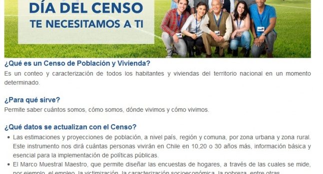 El próximo 19 de abril se aplicará a nivel país, el Censo 2017, que tiene como objetivo poder conocer cuántas personas viven en cada comuna, para desarrollar mejores políticas públicas que vayan en beneficio de un territorio. Para poder realizar el Censo de este año, se necesitan más de 2 mil cencistas en la comuna de Vallenar y es por lo mismo que se invita a todas las personas que cuenten con segundo año medio aprobado a abril de 2017, para que puedan inscribirse en http://www.censo2017.cl/voluntarios/.